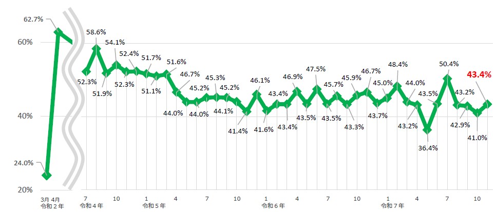 東京都では、都内企業(従業員30人以上)のテレワーク実施率を毎月調査しています。