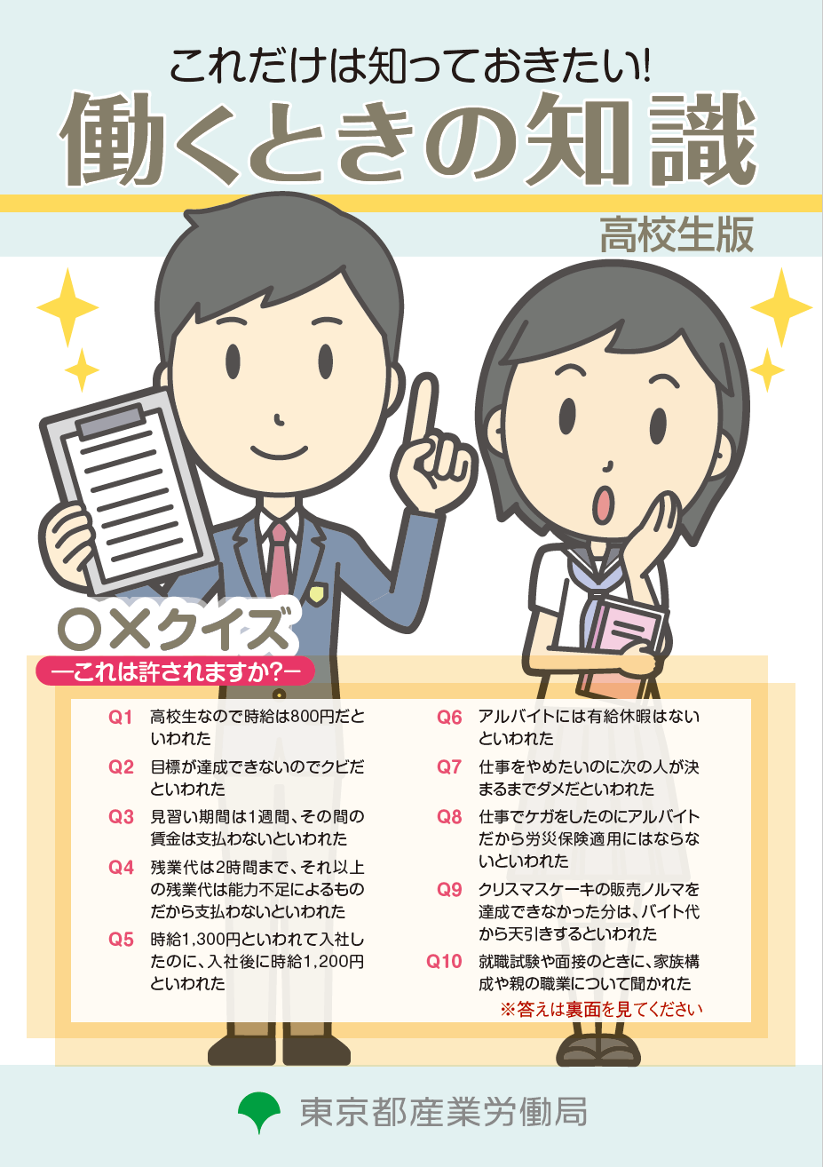 東京都では、アルバイト中、就職活動中及び就職時におけるトラブルを未然に防止するために、学生への労働法の基礎知識の普及を目的とした小冊子を例年発行しております。