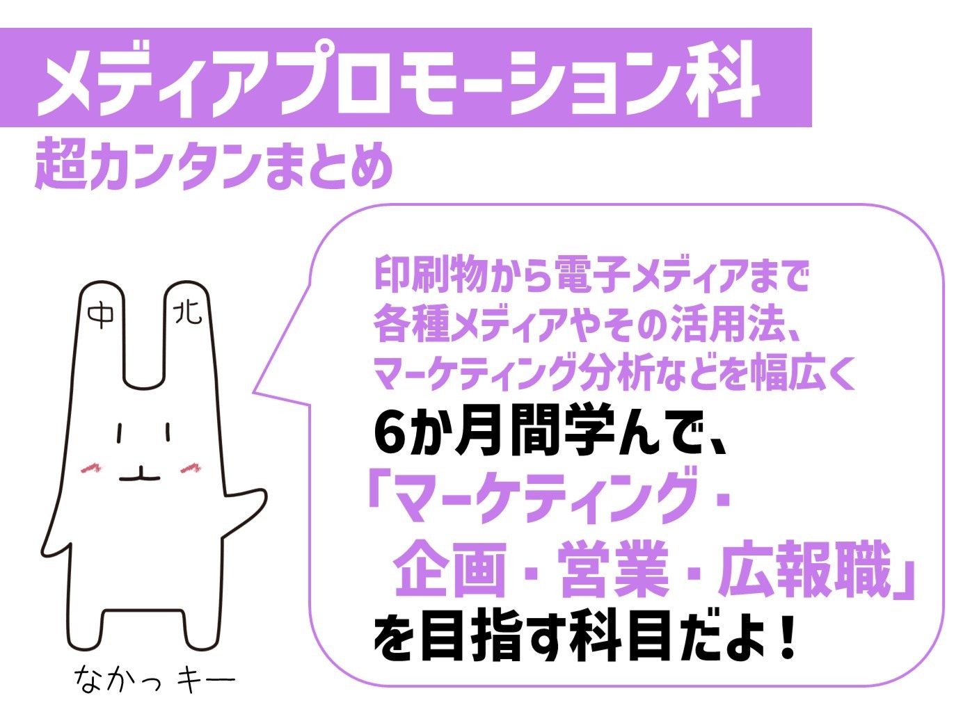メディアプロモーション科は、新しいことを楽しんで知りたい人に向いてます。6か月間、通うことは様々な不安を見つめ直すいい機会です。 クラスメイトと刺激し合い、客観的な他人からの評価が自分の可能性を広げ、多くのことに気づくことができます。