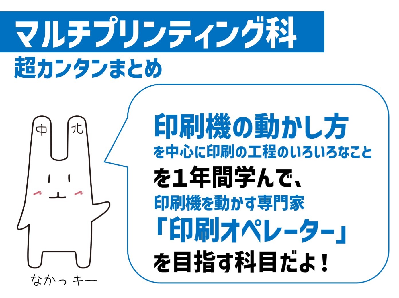 印刷業界では近年、効率的な作業が求められると共に、技術の進化により1人で複数の作業を行う多能工の時代になっています。 当科目は印刷の基礎からパソコン作業(Officeソフト、DTPソフト)、 印刷作業、製本作業、メディア実習等、色々なことを学び印刷業界で活躍できる技術を身に付けます。幅広く学べるので、やりがいがあります。