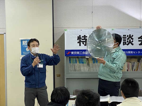 本座談会は、昨年11月に板橋支部と締結した連携協定を具体化した事業で、本年7月の開催に続き2回目の開催となりました。当日は、日本特殊光学樹脂㈱・佐藤公一社長ならびに河島コンクリート工業㈱・河島慎吾社長(いずれも板橋支部工業分科会評議員)にご登壇いただき、板橋校の生徒約60名を対象に、働く楽しさや大変さ、ともに働きたい人材等についてお話しいただきました。参加した生徒からは、「仕事の楽しさ・やりがいは何か」や「社内の意識共有はどのように行っているか」、「社長の仕事とはズバリ何か」など、多くの質問が出ました。