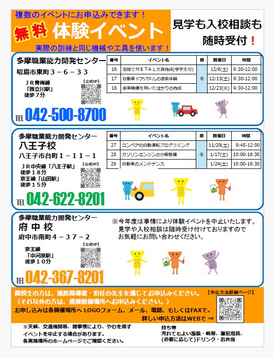 【ものづくり体験イベントの概要】 ※府中校での開催はありません。