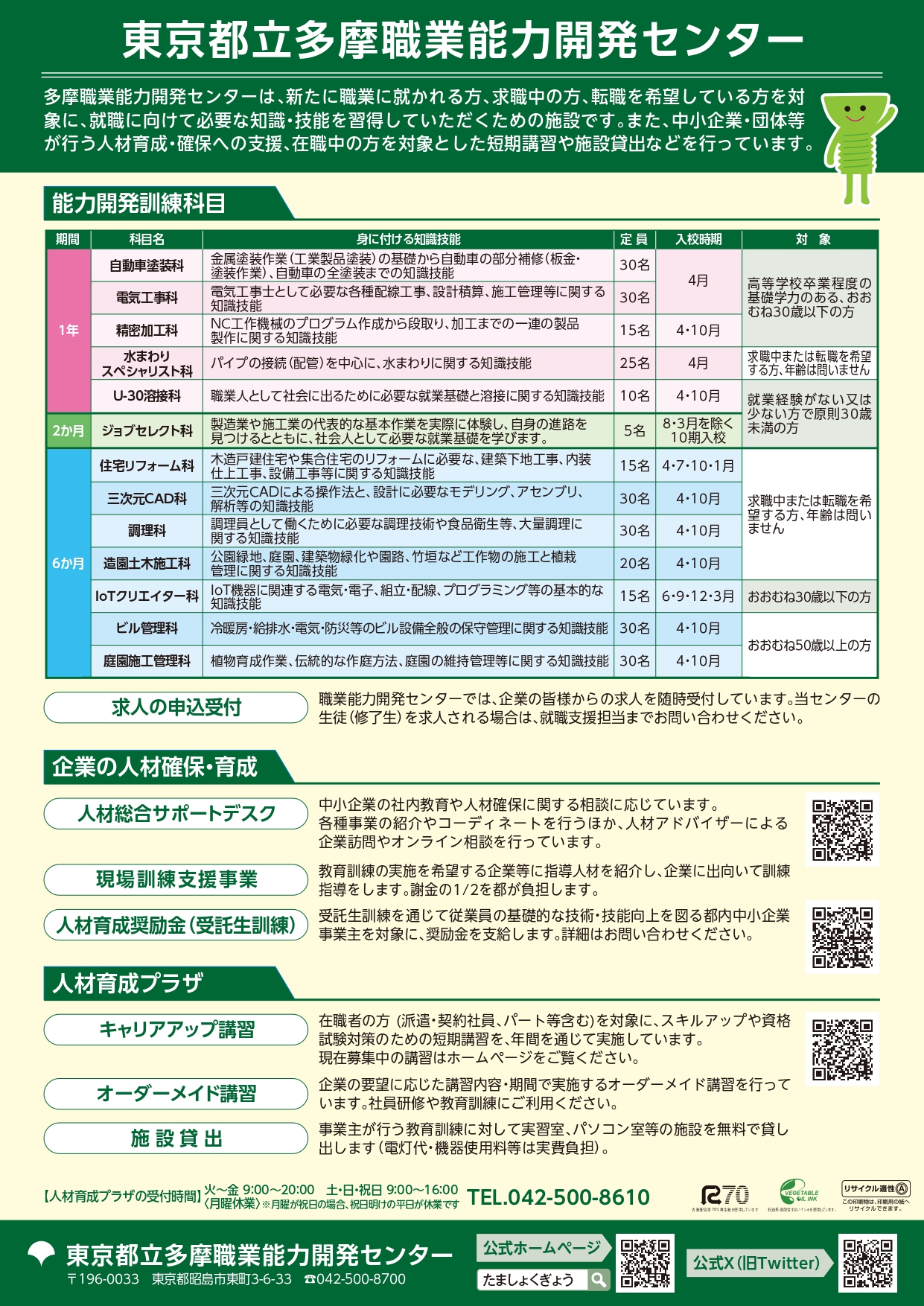 多摩職業能力開発センターでは、職業訓練や中小企業支援など職業能力開発事業を広く地域の皆様に知っ